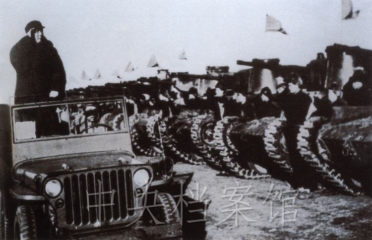 紀(jì)錄片:(群眾呼聲)中國人民萬歲!(紀(jì)錄片解說)檢閱開始了。東北野戰(zhàn)軍參謀長劉亞樓將軍,向毛主席報(bào)告受檢閱的部隊(duì)全部到齊。坦克塔上飄揚(yáng)著紅旗,坦克手精神百倍,向著自己的領(lǐng)袖敬禮。